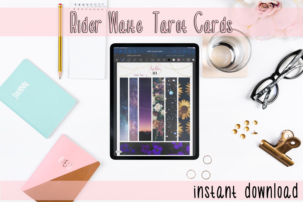 This digital sticker set includes Rider Waites Tarot Cards (22 Major Arcanas + 56 Minor Arcanas), Digital "Washi Tape" + more stickers for GoodNotes.