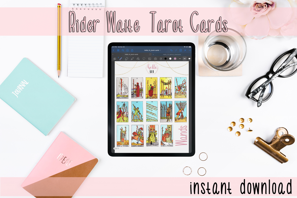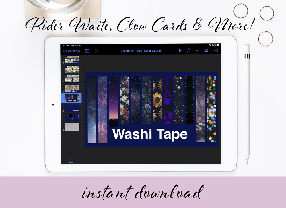 This digital sticker set includes Rider Waites Tarot Cards (22 Major Arcanas + 56 Minor Arcanas), Digital "Washi Tape" + more stickers for GoodNotes.
